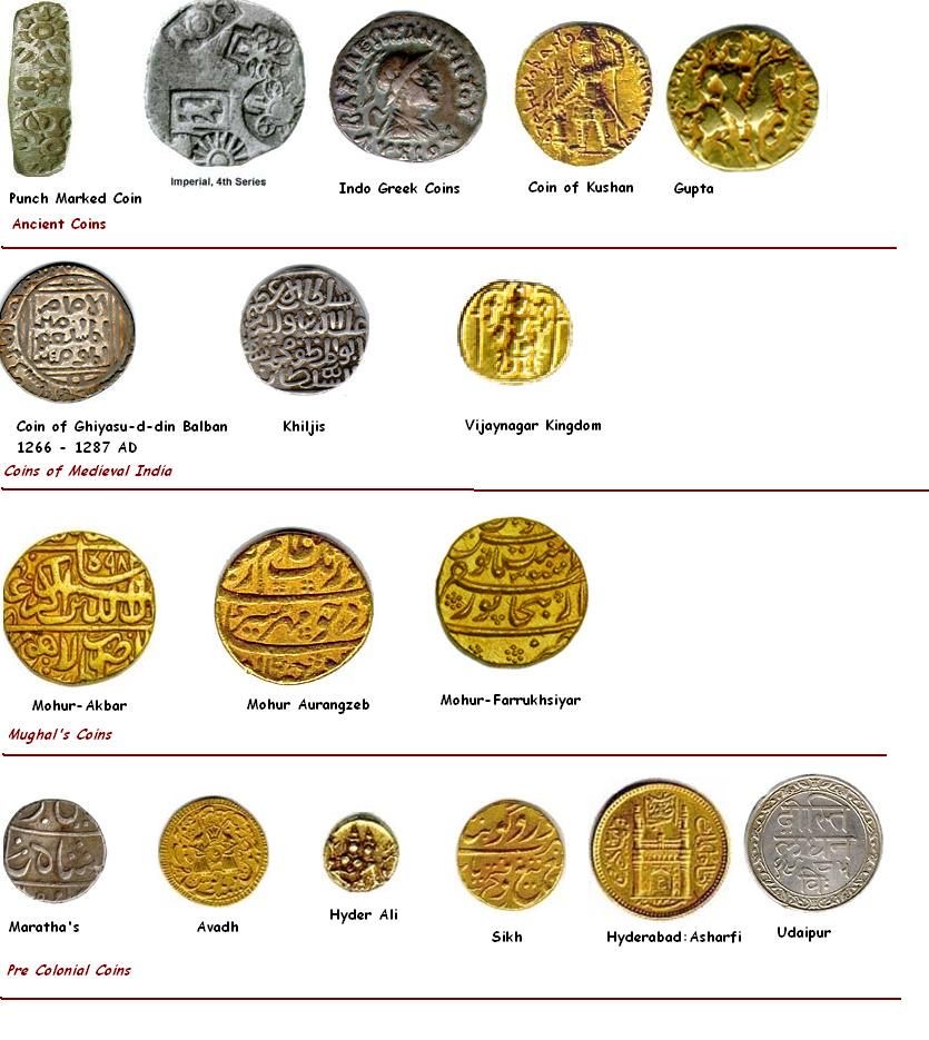 • ਬਹੁਤ ਸਾਰੀਆਂ ਛੋਟੀ ਰਿਆਸਤਾਂ ਦੀ ਆਪਣੀ ਕਰੰਸੀ ਹੋ ਸਕਦੀ ਸੀ, ਪਰ ਮੁਗਲ ਅਤੇ ਬਾਅਦ ਵਿੱਚ ਬ੍ਰਿਟਿਸ਼ ਕਰੰਸੀ ਆਮ ਹੀ ਰਹੀ